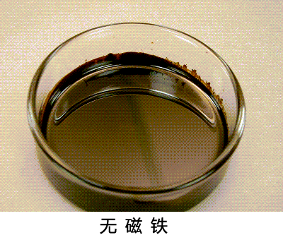來(lái)自網(wǎng)絡(luò)的一段視頻演示了磁流體的特性,見(jiàn)下面視頻。玻璃盤(pán)中裝有磁流體,在無(wú)磁場(chǎng)作用時(shí),盤(pán)中磁流體平鋪在盤(pán)中,當(dāng)在盤(pán)底有一個(gè)磁極向上的磁鐵接近時(shí),磁流體出現(xiàn)沿磁力線方向伸展的凸起,這是磁性固體顆粒沿磁力線排列的現(xiàn)象。 |