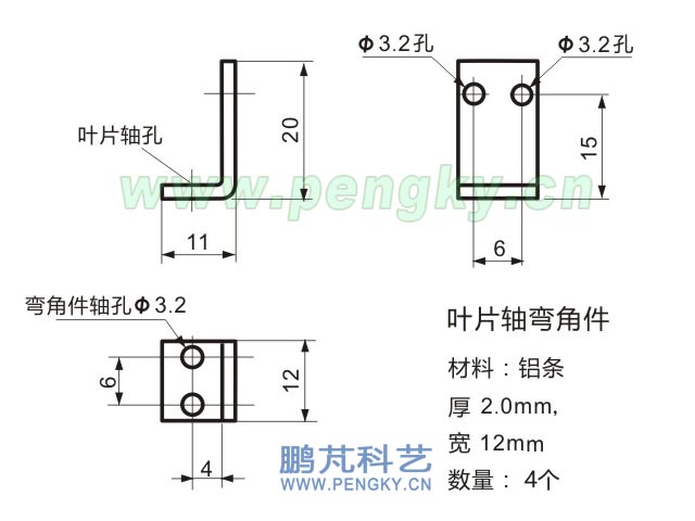 葉片軸通過彎角件固定在葉片上,彎角件采用寬12mm,厚2mm的鋁帶彎成,尺寸見圖15,彎角件共有4個(gè)。在彎角件一端軸孔中裝上長(zhǎng)15mm的M3螺絲,用螺母擰緊作為葉片軸,2個(gè)彎角件的螺絲在一側(cè),另2個(gè)彎角件的螺絲在另一側(cè)。見圖8下部分的4個(gè)彎角件。 |