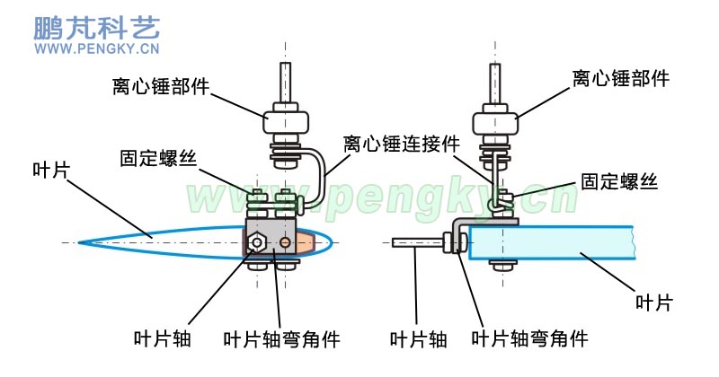 在葉片下端的彎角件螺絲上安裝離心錘部件,圖17是安裝圖。 |