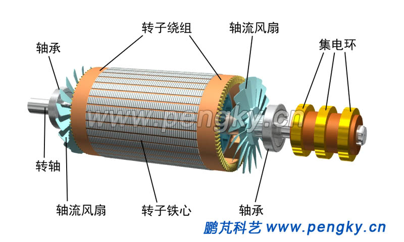轉(zhuǎn)子鐵芯的槽內(nèi)嵌放著轉(zhuǎn)子繞組,按4極三相交流繞組繞制,三個繞組連接成星形接法,接入三相交流電源會在轉(zhuǎn)子鐵心外周產(chǎn)生旋轉(zhuǎn)磁場。不管定子與轉(zhuǎn)子的槽數(shù)各為多少,定子繞組與轉(zhuǎn)子繞組的極數(shù)必須相同。