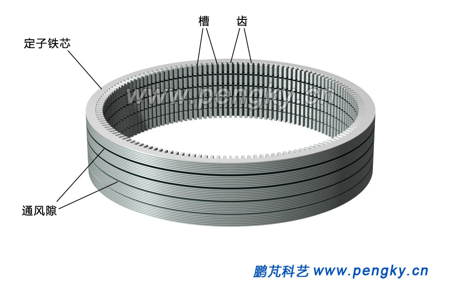 發(fā)電機定子鐵芯由導(dǎo)磁良好的硅鋼片疊成,在鐵芯內(nèi)圓均勻分布著許多槽,