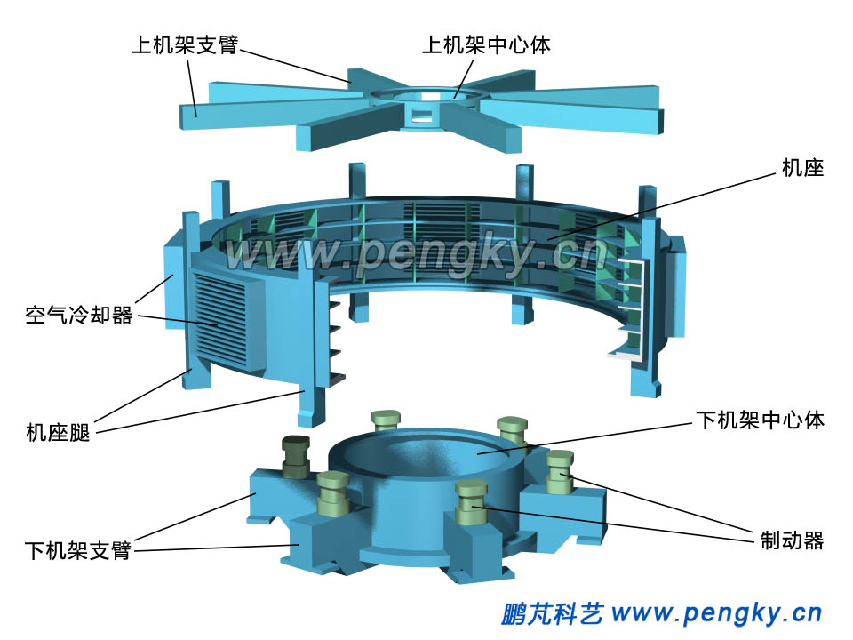 轉(zhuǎn)子支架外側(cè)上下端有上外環(huán)與下外環(huán)加固支臂,并有環(huán)形端面讓空氣流向磁軛。轉(zhuǎn)子支架下側(cè)還有制動環(huán),是轉(zhuǎn)子的剎車環(huán)。 |