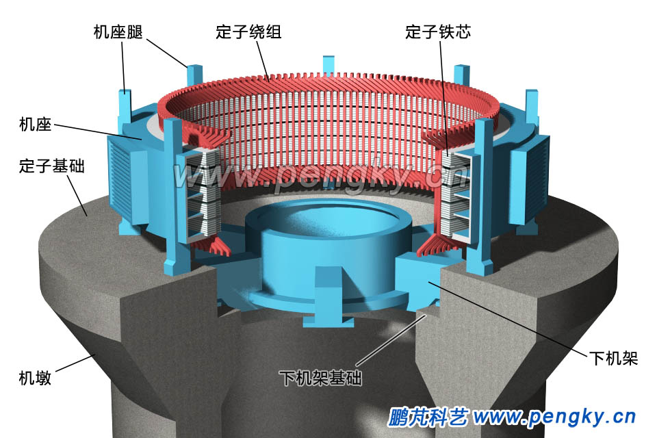 機座與下支架安裝在由混凝土澆筑的機墩上,機座的腿安裝在機墩的定子基礎(chǔ)面上,下支架支臂安裝在下機架基礎(chǔ)面上。在機座上安裝定子鐵芯與定子繞組,見圖12。 |