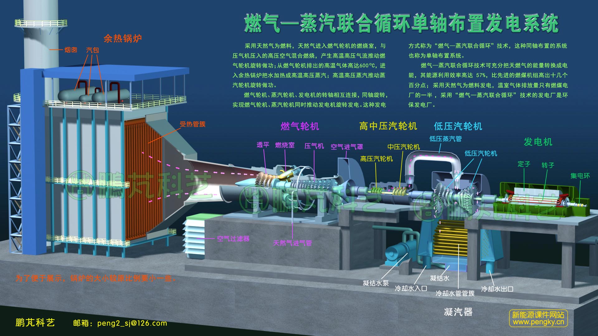 | 這是燃?xì)狻羝?lián)合循環(huán)發(fā)電機(jī)組的整體布置模型,為了便于展示,余熱鍋爐的大小較原比例要小一些。在模型中展示了燃?xì)廨啓C(jī)、高中壓蒸汽輪機(jī)、低壓蒸汽輪機(jī)、發(fā)電機(jī)的安裝位置,它們是安裝在同一軸線上,同軸運(yùn)轉(zhuǎn),是典型的單軸布置機(jī)組。 |