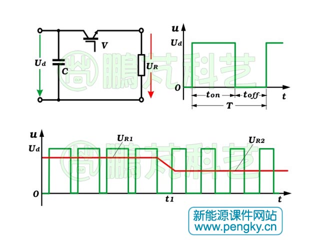 直流斬波電路簡單,是使用廣泛的直流變換電路。圖1左上部是一個斬波基本電路,Ud是輸入的直流電壓,V是開關(guān)管,UR是負載R上的電壓,開關(guān)管V把輸入的Ud斬成方波輸出到R上,圖1右上部綠線為斬波后的輸出波形,方波的周期為T,在V導(dǎo)通時輸出電壓等于Ud,導(dǎo)通時間為ton,在V關(guān)斷時輸出電壓等于0,關(guān)斷時間為toff,占空比D=ton/T,方波電壓的平均值與占空比成正比。圖1下部綠線為連續(xù)輸出波形,其平均電壓如紅線所示。改變脈沖寬度即可改變輸出電壓,在時間t1 前脈沖較寬、間隔窄,平均電壓(UR1)較高;在時間t1 后脈沖變窄,平均電壓(UR2)降低。固定方波周期T不變,改變占空比調(diào)節(jié)輸出電壓就是(PWM)法,也稱為定頻調(diào)寬法。由于輸出電壓比輸入電壓低,稱之為降壓斬波電路或Buck變換器。 |