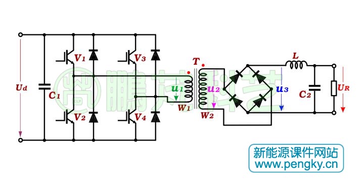 到時間T2時,開關(guān)管V1與V4導(dǎo)通,全橋輸出電壓u1為Ud;