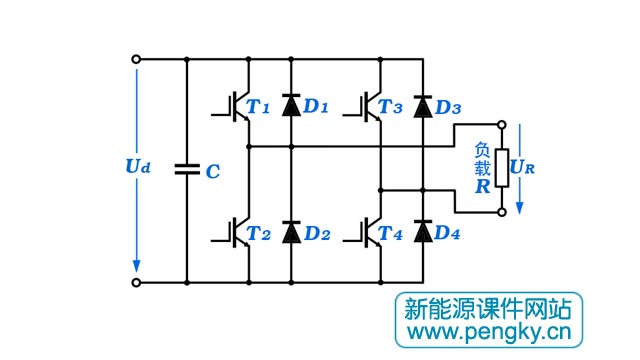圖中Ud是直流輸入電壓,為穩(wěn)定電壓配有電容C,4個開關(guān)晶體管T1、T2、T3、T4,4個開關(guān)管的保護二極管(續(xù)流二極管)D1、D2、D3、D4,輸出交流電到負載R。下面就具體分析這個電路。圖7與圖8是輸出正向與負向電流流向圖,為清晰起見把電路簡化,只保留主要器件。