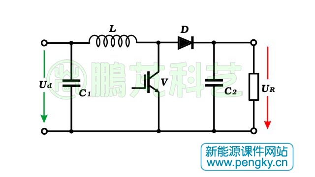 該電路稱為升壓斬波電路或Boost變換器,輸出電壓UR= Ud/(1-D),D是占空比,值必須小于1。
