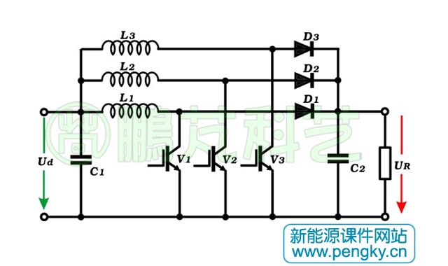 升壓斬波電路在新能源控制設(shè)備中應(yīng)用很廣,為了減小輸出電壓的波紋,通常采用多通道多重化并聯(lián)升壓型變換電路,圖4是三通道多重化并聯(lián)升壓型變換電路。L1、V1、D1組成通道1,電路與工作原理與前面介紹的單通道升壓斬波電路相同;L2、V2、D2組成通道2,電路與工作原理與前面介紹的單通道升壓斬波電路相同;L3、V3、D3組成通道3,電路與工作原理與前面介紹的單通道升壓斬波電路相同。三個通道開關(guān)周期相同、通斷時間相同,關(guān)鍵是三個開關(guān)管通斷時間必須均勻錯開才能起到降低輸出波紋的作用。多通道并聯(lián)電路可增大輸出電流。 |