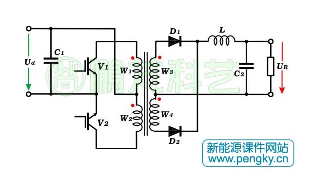 推挽式功率變換電路電路簡單,使用器件少,但開關(guān)管要承受兩倍的輸入電壓,一般只在微、小型變換器中使用。 |