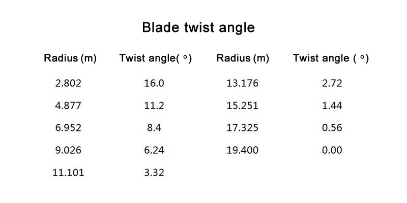 | This twist angle is different for different wind turbines and blades, but there is little difference between large and medium wind turbines. The data in the attached table below is from the book Design, Manufacture and Operation of Wind Turbines. The data in the table is a rotor with a radius of about 40 m and the twist angle of the blades at different radius. This angle is the design optimization value for the optimum operating wind speed of 8 m/s. |